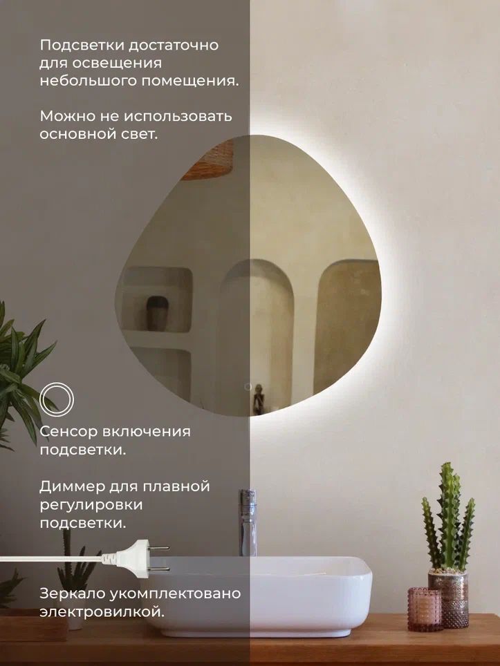 Холодный белый свет (6000 К) создает ощущение свежести и чистоты, а интерьерная (фоновая) подсветка мягко окутывает пространство, создавая уютную атмосферу. Зеркала работают от стандартной сети 220 В.